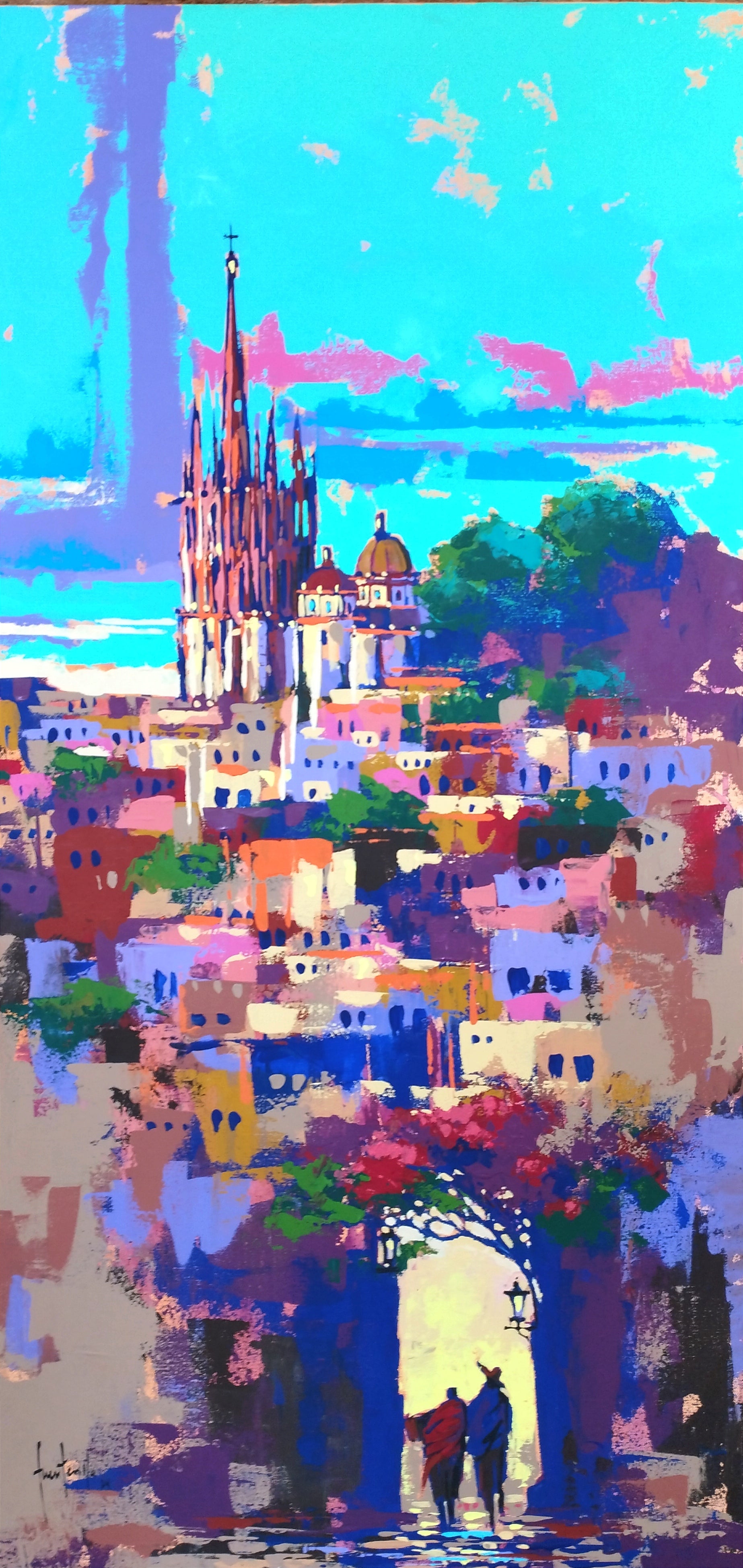 A través de una paleta de colores vibrantes y luminosos, el artista capta la esencia de este lugar lleno de historia y tradición. Una pareja que camina cogida del brazo simboliza el amor y la conexión con la tierra, mientras que la majestuosa y colorida Parroquia de San Miguel Arcángel se erige en el corazón de la composición. El cielo azul, salpicado de pinceladas de color, refleja la alegría y vitalidad de este lugar.