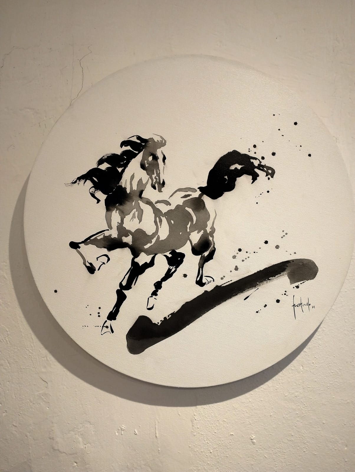 El lienzo circular refuerza la sensación de movimiento infinito, como si el caballo pudiera continuar su galope más allá de los bordes. He querido reducir la composición a sus elementos más esenciales, dejando que el espacio negativo desempeñe un papel en la narración.