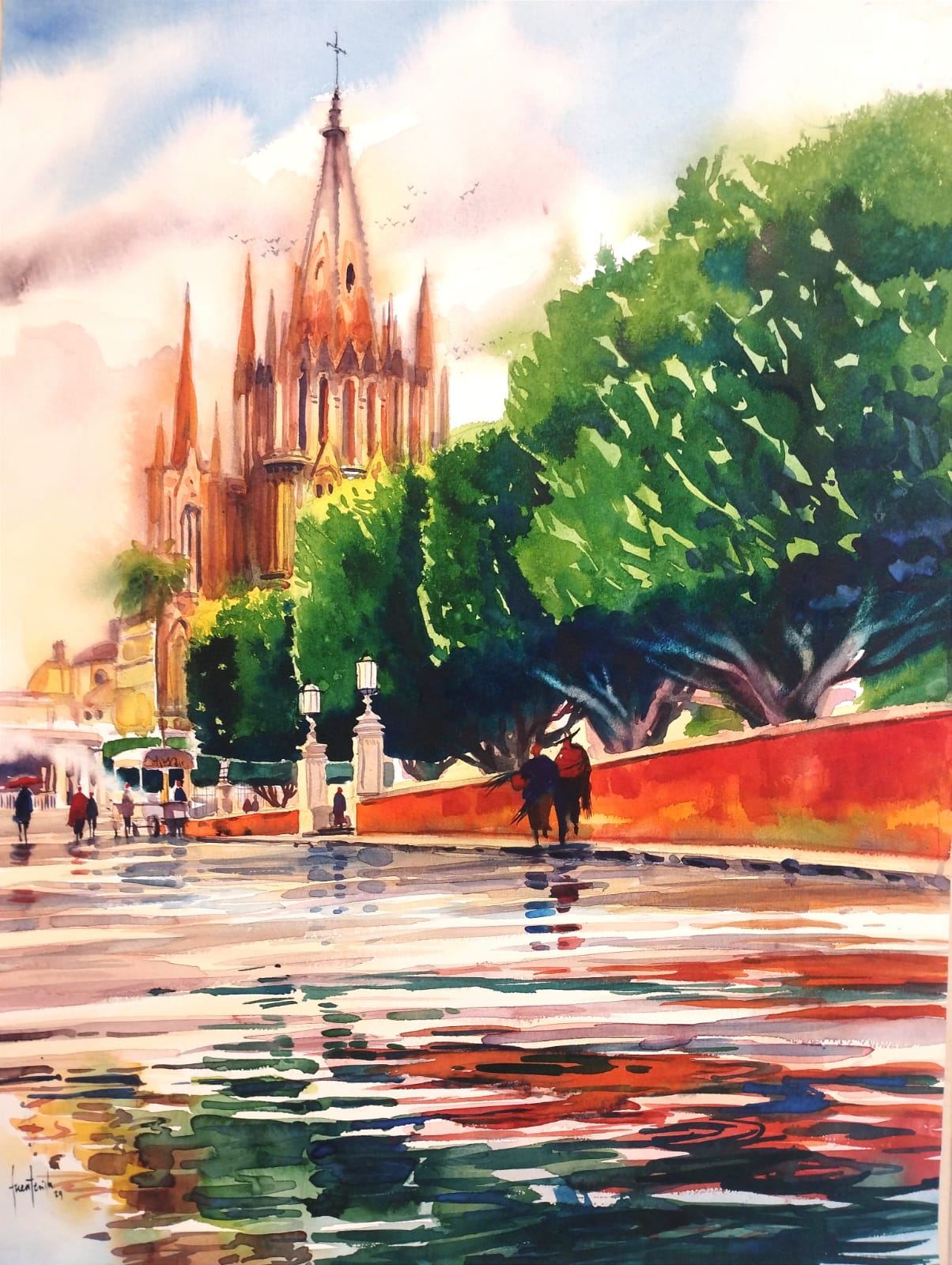 Me atrajo la forma en que el suelo mojado transformaba el paisaje familiar en un lienzo de reflejos. La histórica Parroquia de San Miguel Arcángel se alza majestuosa, suavizada por la niebla y enmarcada por una exuberante vegetación, mientras el agua del pavimento captura su esencia en una danza de ondas y luz.