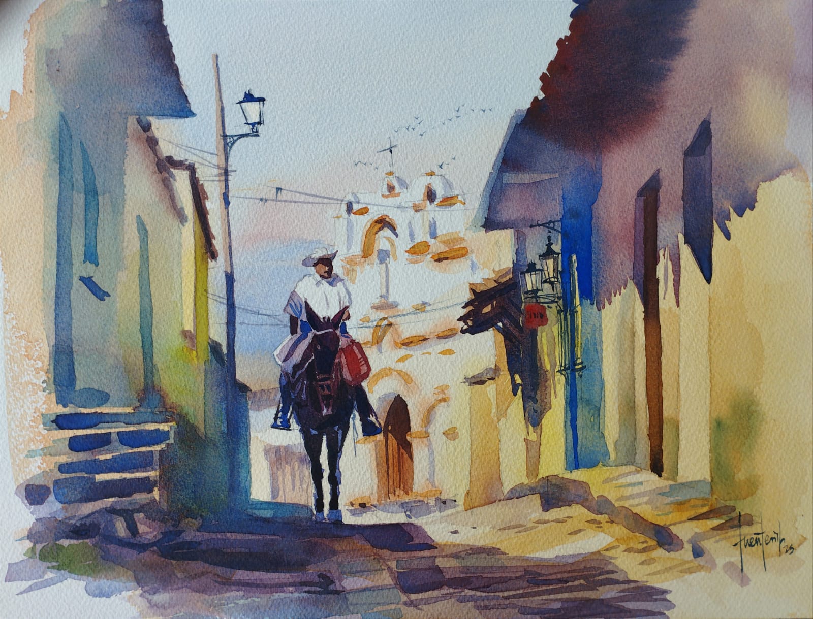 I was inspired by those early morning scenes in small Mexican towns—when the day is just beginning, shadows stretch long, and the only sound is the steady rhythm of hooves on cobblestone. I wanted to paint that calm dignity of the rider heading to work, framed by the timeless presence of a church in the background.