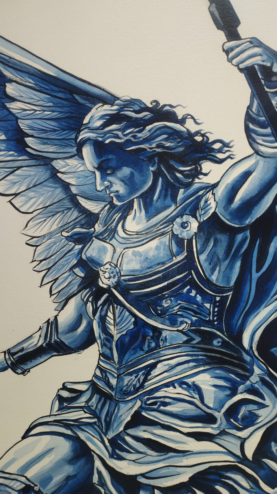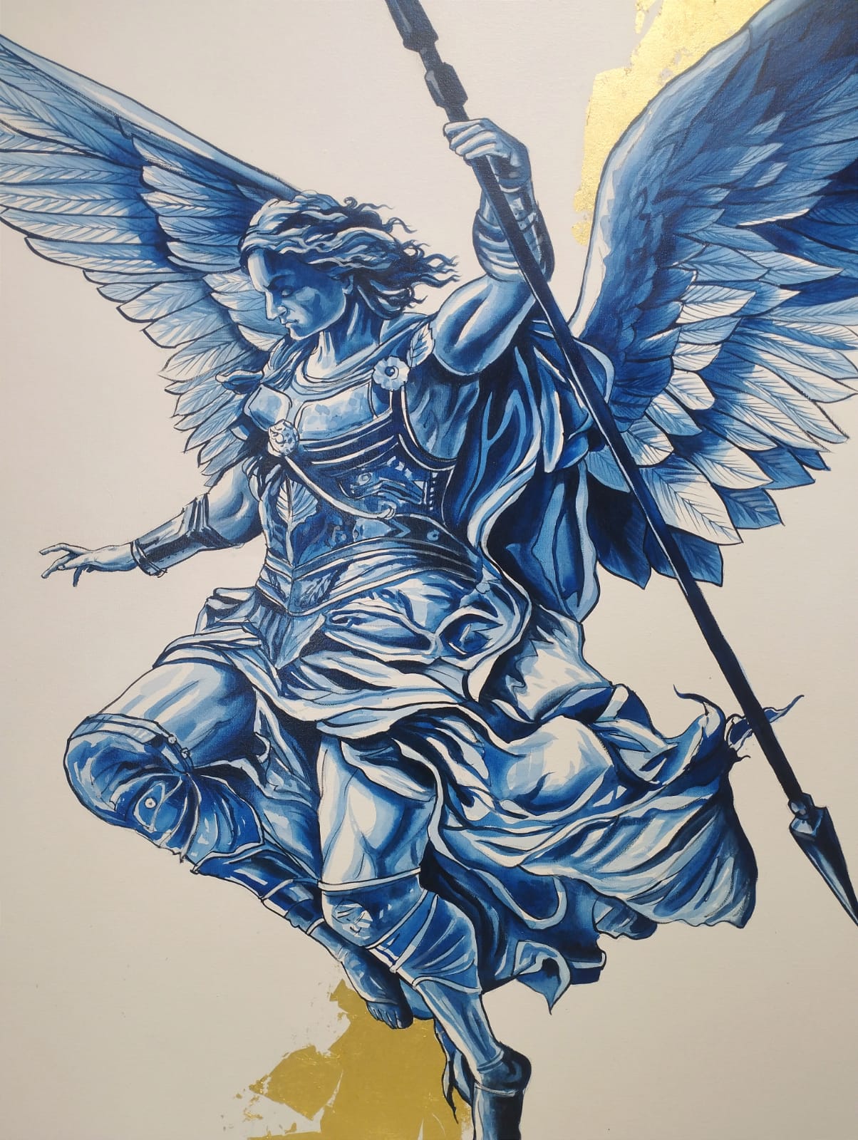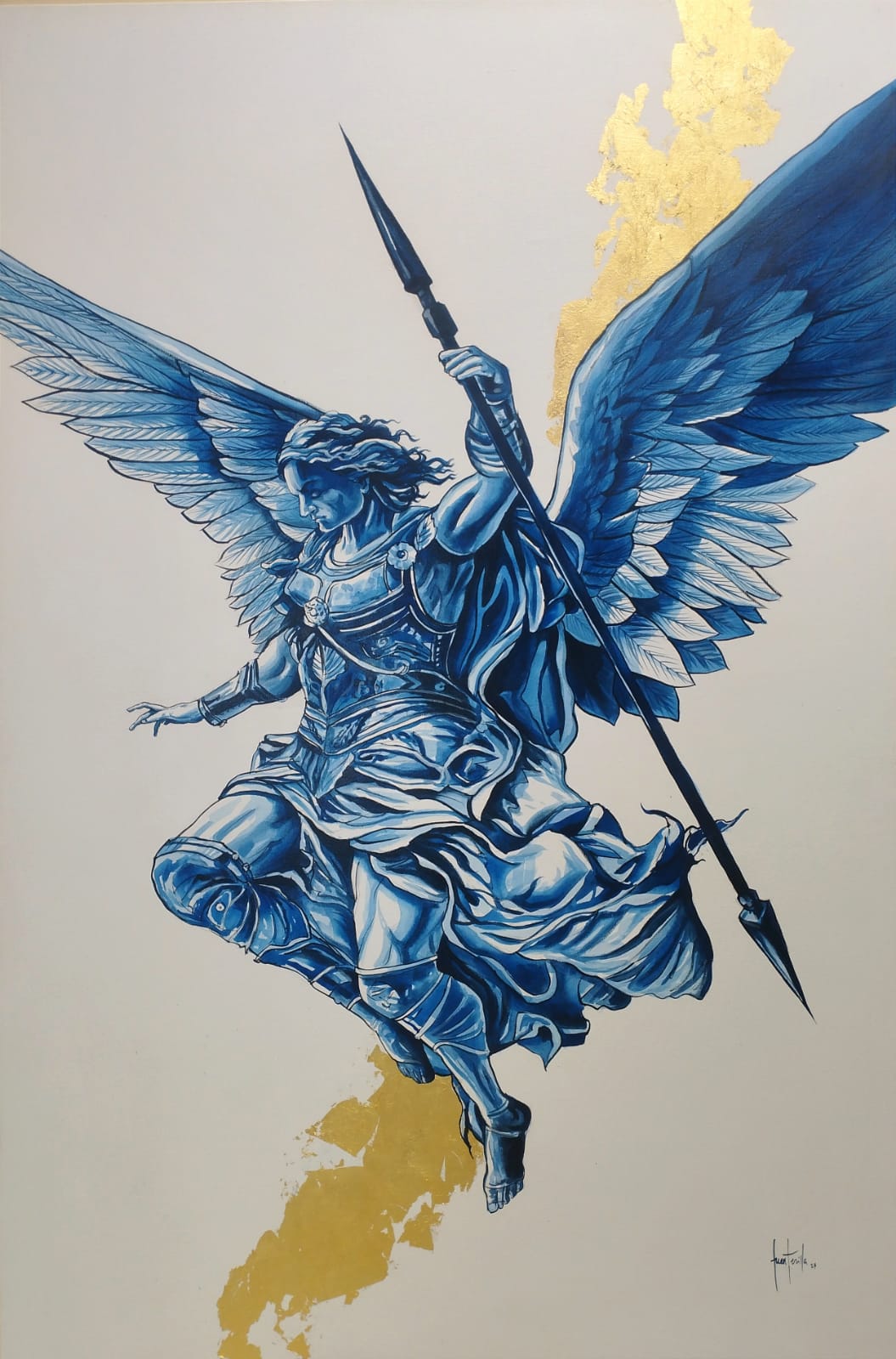 En esta pieza, el Arcángel San Miguel desciende con armadura completa, representado en tonos azules intensos que transmiten serenidad y fuerza. Sus alas se extienden con majestuosidad, capturando el movimiento y la gracia, mientras los detalles dorados evocan luz divina y poder celestial. Los acentos en oro refuerzan el carácter sagrado de la imagen, elevando la dimensión espiritual de la escena. La composición combina iconografía clásica con una ejecución moderna y estilizada, entrelazando devoción con expresión artística.
