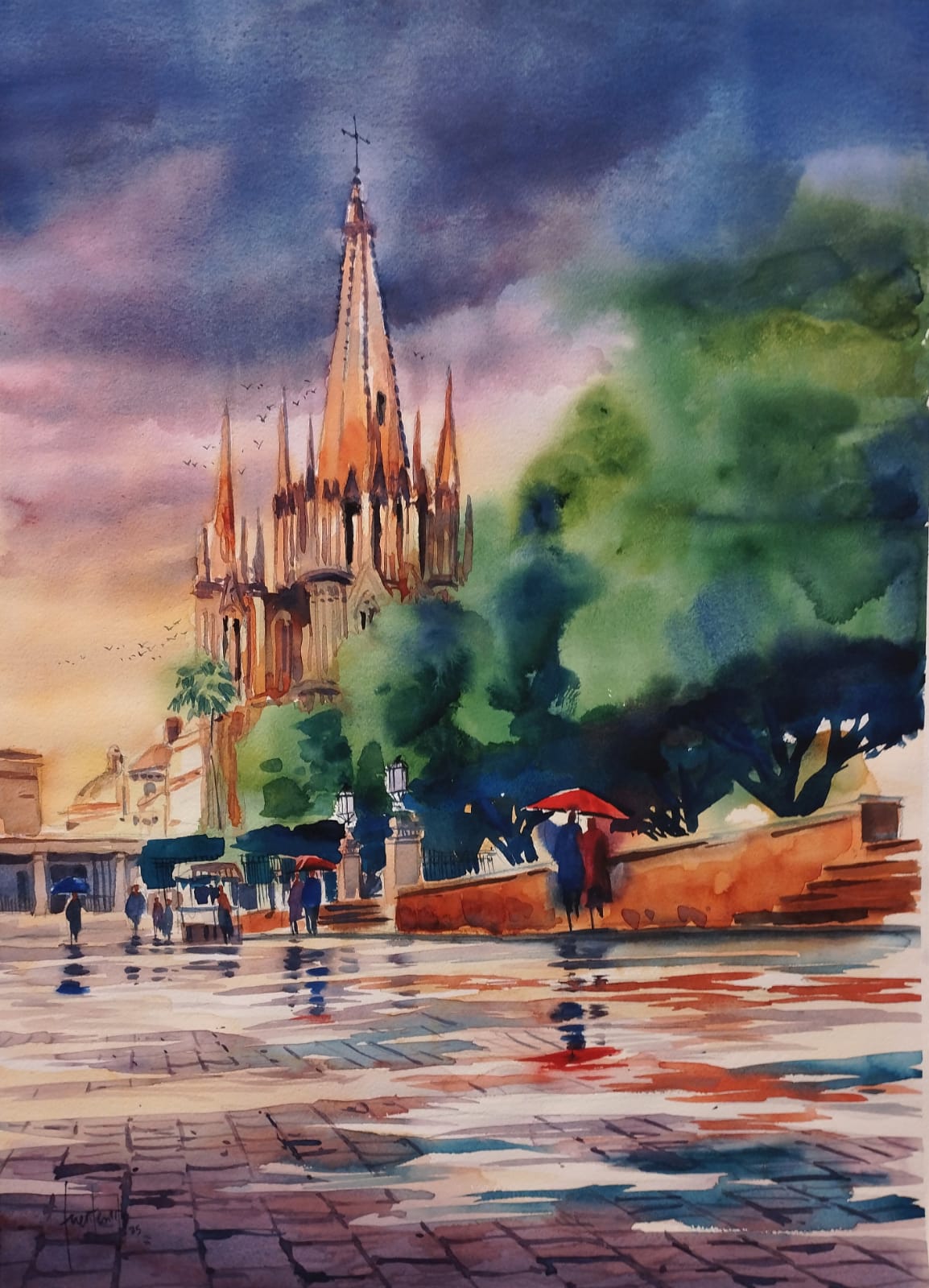 I wanted to capture San Miguel not in sunlight, but in reflection, when the wet stones mirror the sky and umbrellas bloom like flowers against the grey. There’s a calm that follows the rain, a kind of shared silence among strangers walking beneath the cathedral’s gaze. In this watercolor, every puddle becomes a palette and every shadow tells a story.