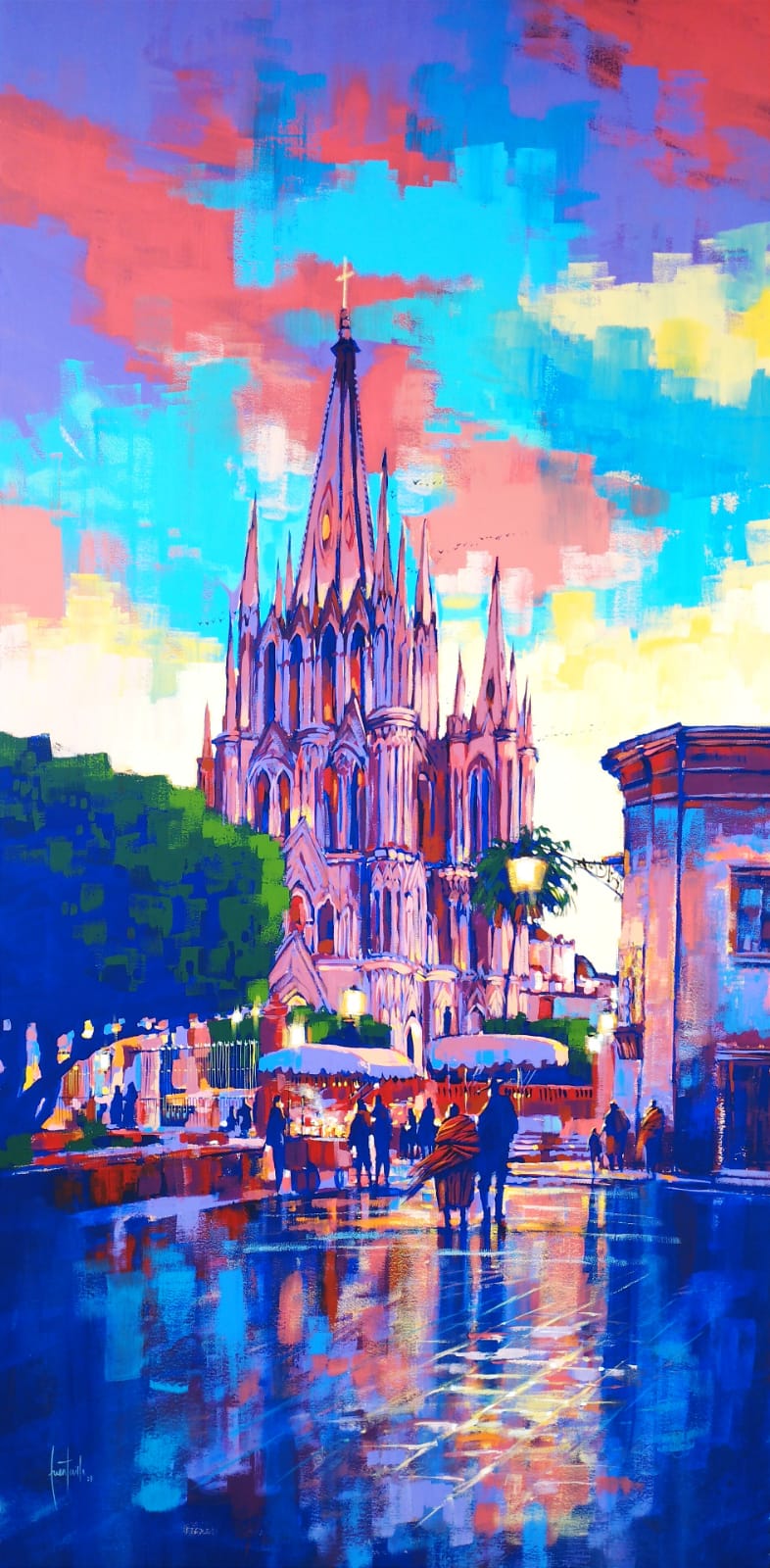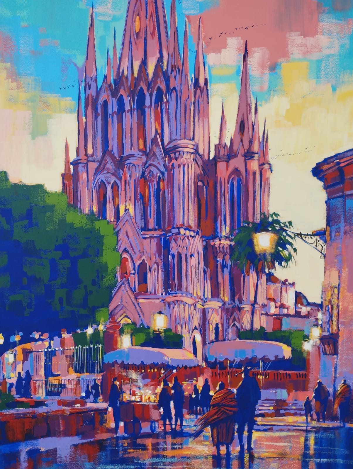 This painting captures one of the most iconic views of San Miguel de Allende—the majestic Parroquia de San Miguel Arcángel glowing under a sky ablaze with color.