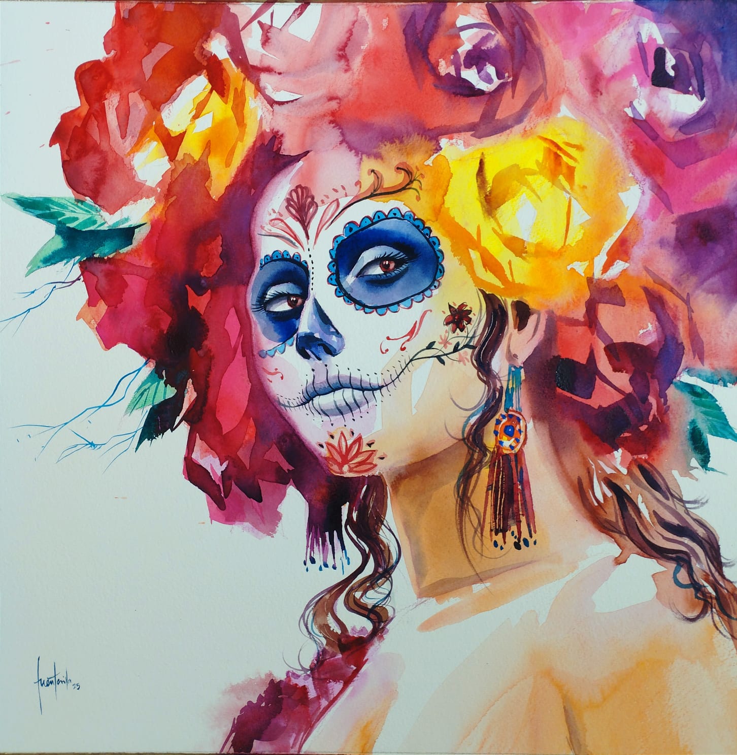 Esta poderosa imagen retrata a una mujer con el rostro pintado como calavera, en clara alusión al Día de Muertos, fusionando belleza, identidad y memoria. Su mirada desafiante y serena contrasta con el dramatismo del tocado floral que la envuelve: una explosión de rojos, amarillos y rosas que simbolizan tanto la vida como la muerte. Los detalles delicadamente ornamentales del maquillaje y los aretes artesanales completan una escena vibrante y profundamente mexicana, donde la tradición se convierte en arte contemporáneo.