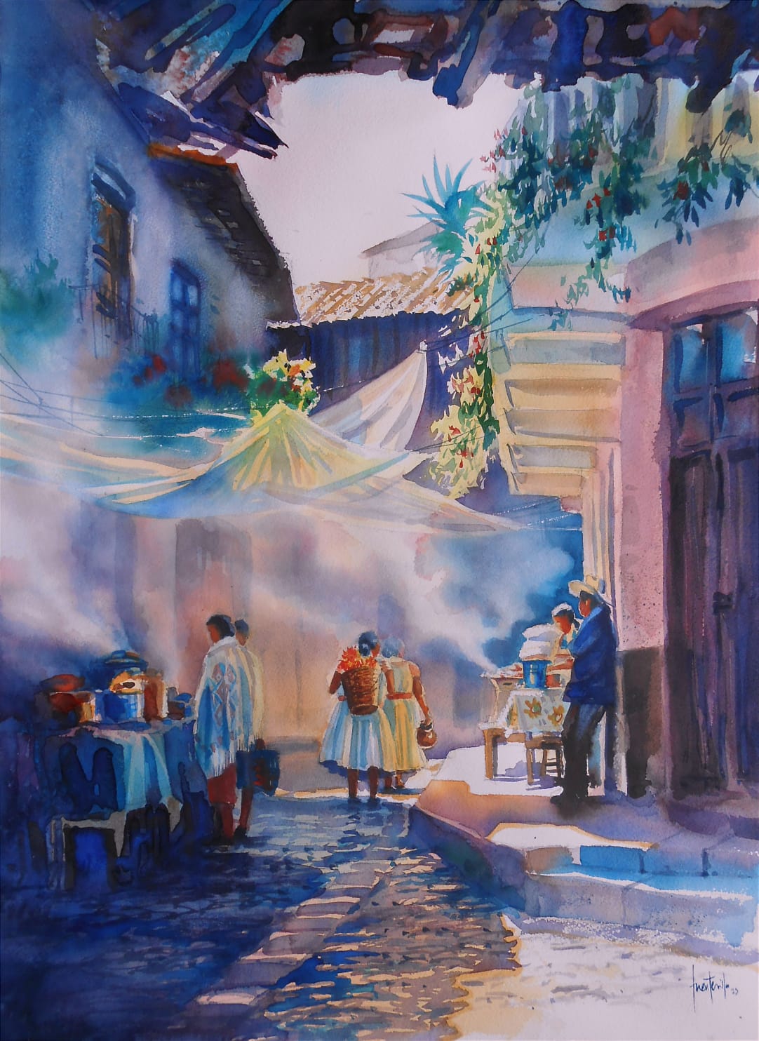 In this watercolor, lunchtime unfolds on a cobblestone street filled with steam and delicious aromas. Under fabric canopies that soften the light, women in traditional skirts walk between smoking food stalls, carrying baskets and pots. Shades of blue and violet bathe the scene in a cool, nostalgic atmosphere, while touches of yellow and orange suggest the warmth of the sun and the cooking fires. The painting captures the intimacy of a Mexican street market, where everyday life turns into poetry.