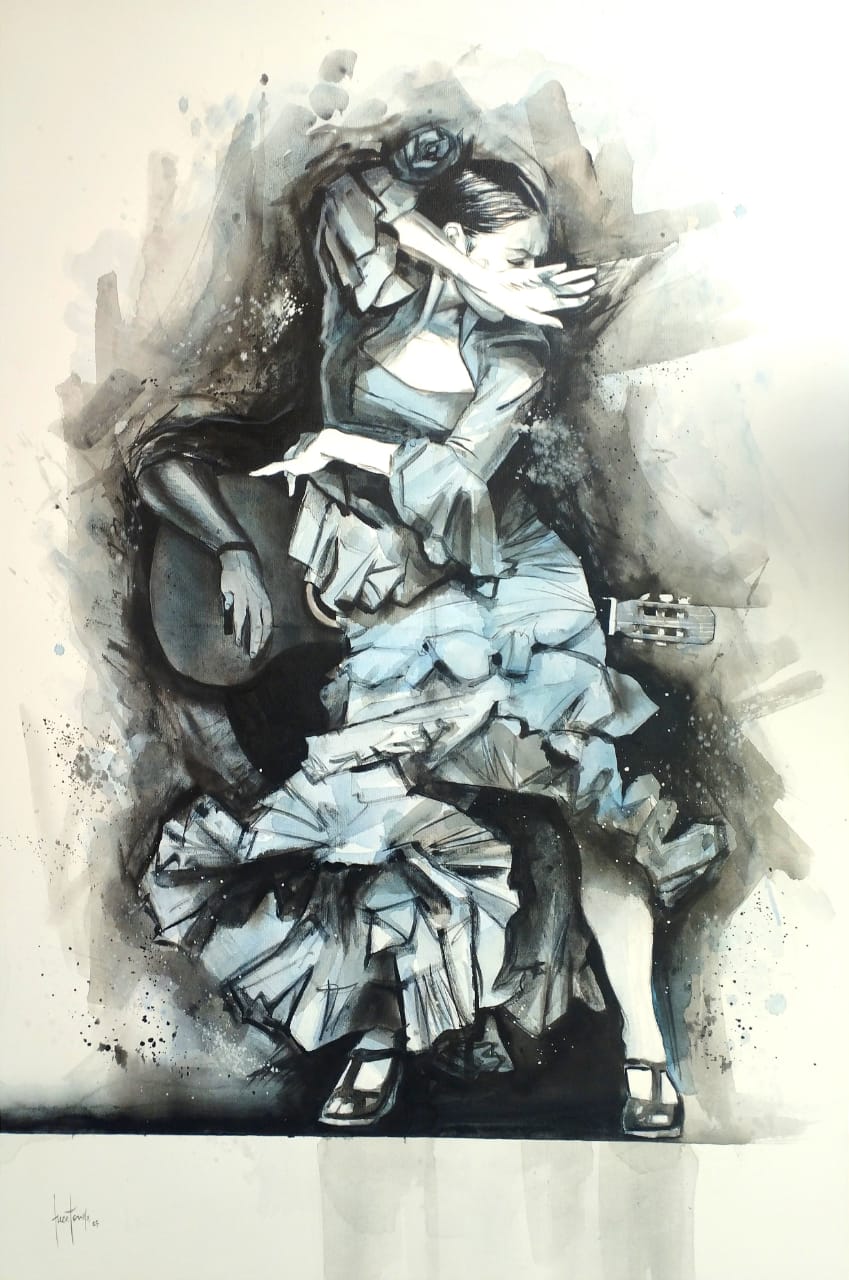 "Danza nocturna" was born from my desire to capture the intensity and passion that emerge in a fleeting moment of flamenco. Every brushstroke, every shadow aims to convey not just the dancer's movement but also the story she tells with each gesture and every swirl of her dress.