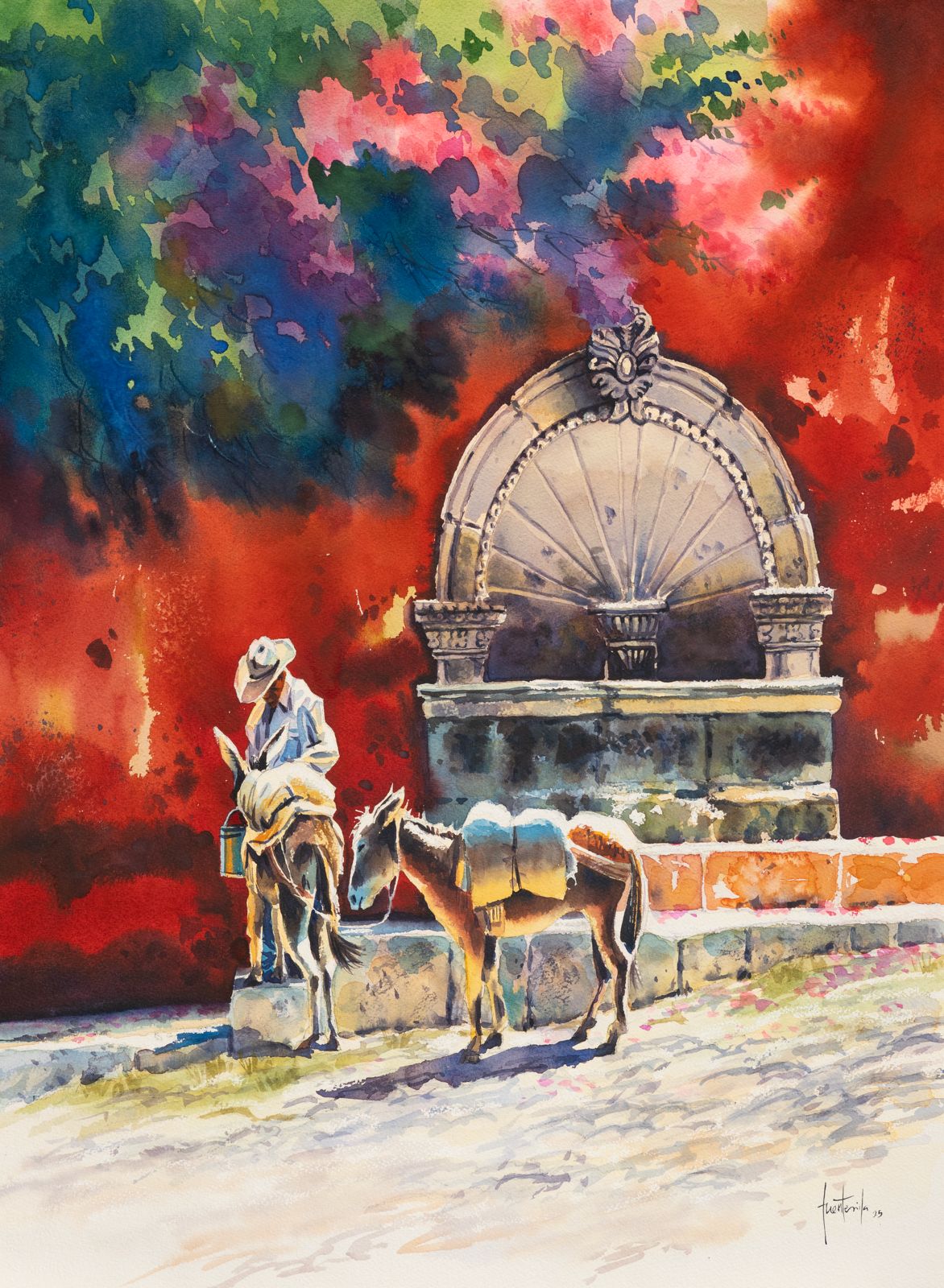 A farmer pauses beside an old stone fountain while his loaded donkeys rest in the shade of a deep red wall. The burst of color in the foliage contrasts with the calm of the scene, capturing that intimate moment when work stops to make room for rest and food. Sunlight brushes the stone and cobblestones, creating reflections that evoke the warmth and stillness of a midday in the village.
