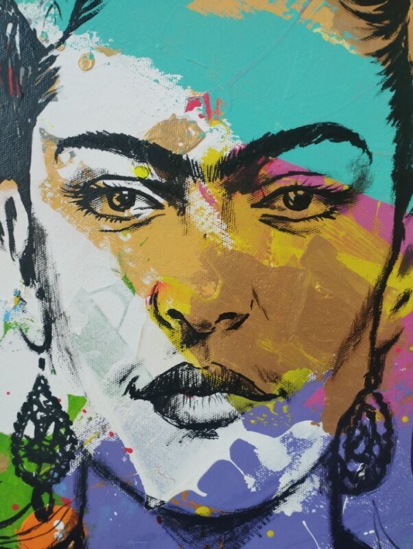 The circular canvas enhances the composition’s harmony, inviting viewers to experience Frida’s world through a modern and dynamic perspective. This artwork is a fusion of cultural pride and contemporary expression, perfect for collectors seeking inspiration and passion in their spaces.