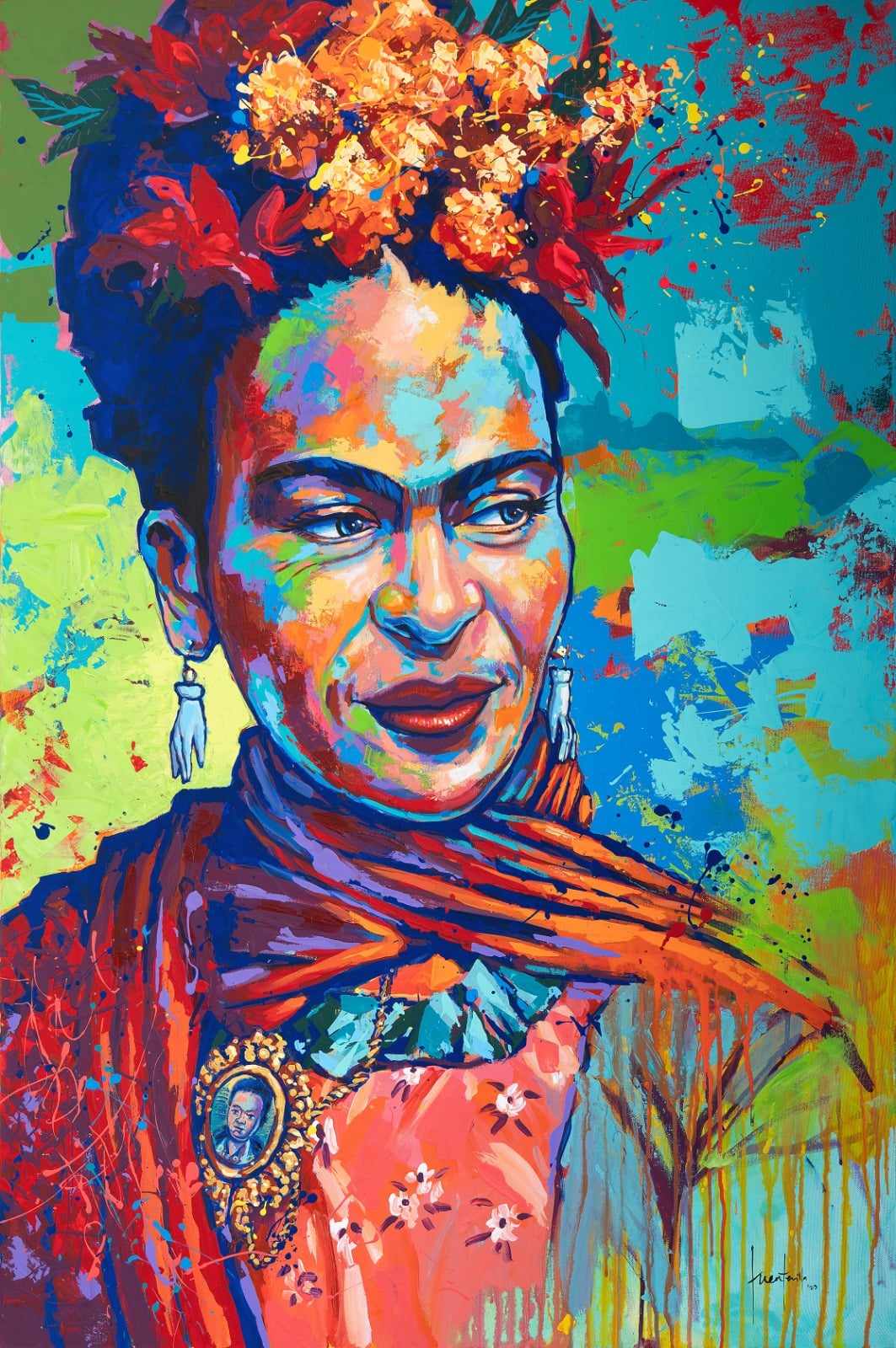 As I painted this piece, I was drawn to Frida's strength and vulnerability, qualities that resonate deeply. Her vibrant presence and unwavering commitment to her identity inspired me to use bold colors and expressive strokes to convey her essence. The intertwining shades of red, blue, and gold reflect the harmony and discord that defined their relationship.