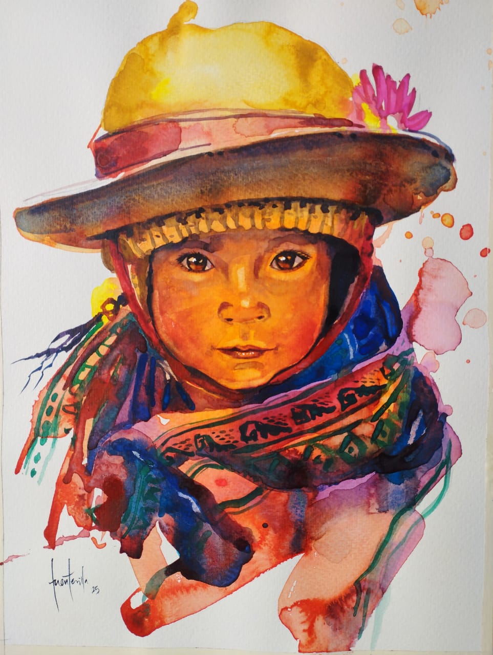 Using watercolors, I aimed to convey the fluidity and layered textures of her clothing, with splashes of reds, blues, and yellows that mirror the dynamic life and traditions of Peru. The spontaneous drips and blends of color around her figure enhance the sense of life and movement, symbolizing the ever-evolving nature of cultural heritage.