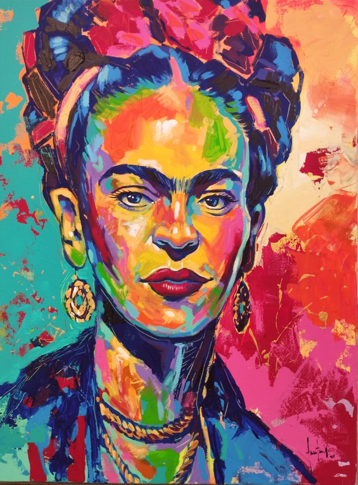 "Vista de Frida" is my interpretation of the strength and unbreakable spirit of Frida Kahlo. Through an explosion of vibrant colors, I aimed to capture not just her face but the intensity of her gaze—a look that seems to pierce through the canvas and speak directly to the soul.
